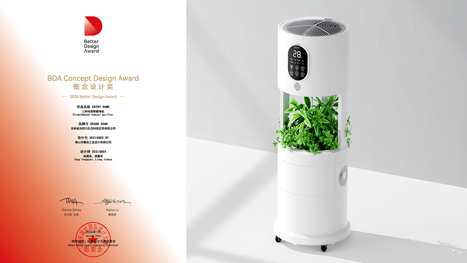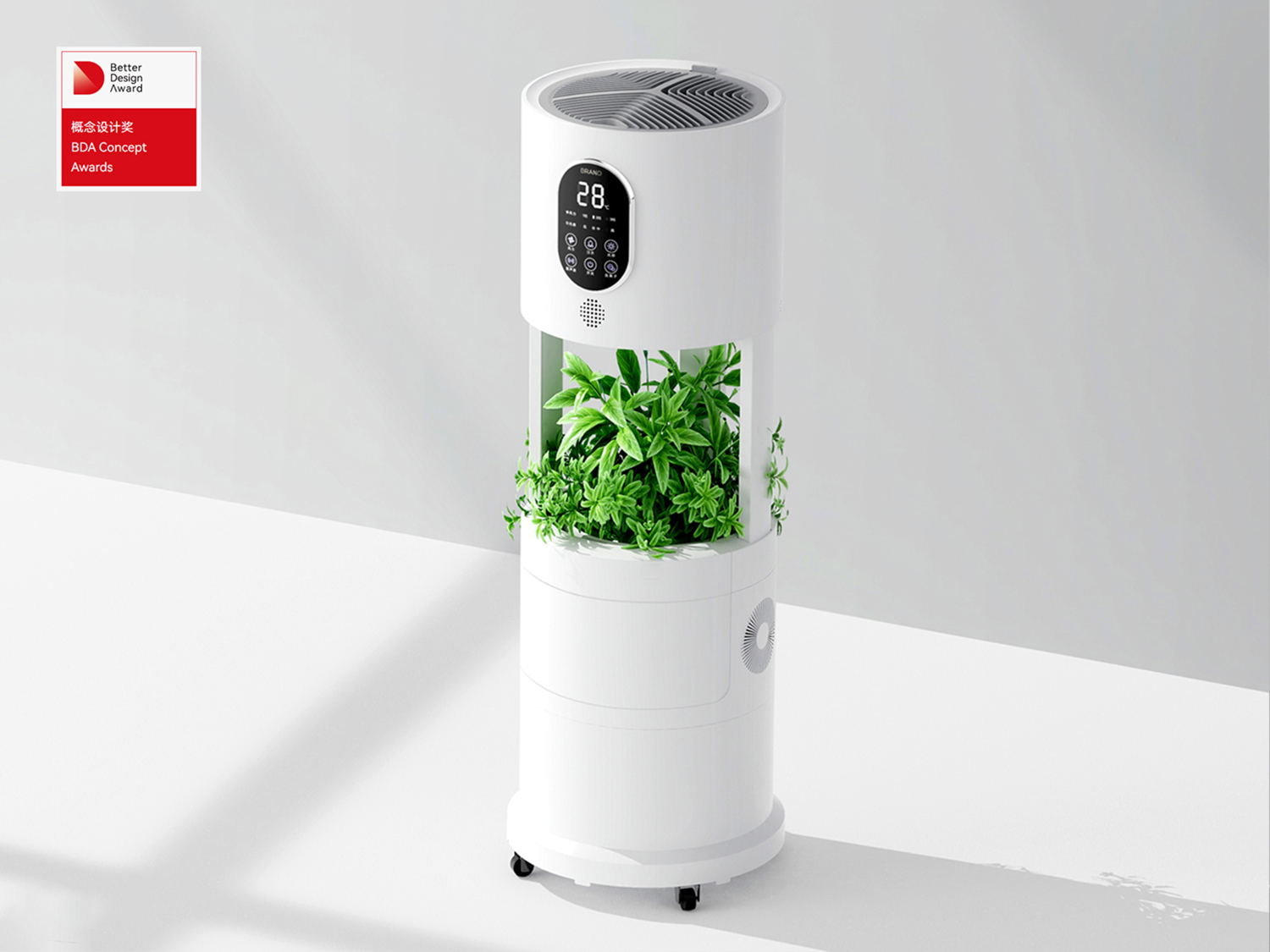 集品设计为吉林省自然力生态科技应用有限公司设计的三林哈吾斯醛净机,是一种基于植物滤芯和生物净化的空气净化器,专用于装修后空气污染。当前装修污染治理主要依赖活性炭吸附、光催化氧化等技术,存在净化效能不足、时效性差、耗材寿命短、功能单一等问题。该产品通过特殊培育的天然生态滤芯植物与降解微生物群组成污染物分解核心,能够快速吸收分解装修后室内空气中的甲醛,去除率可达到99%以上。苯系物,TVOC等污染物,也可高效去除。